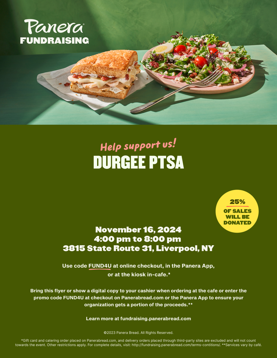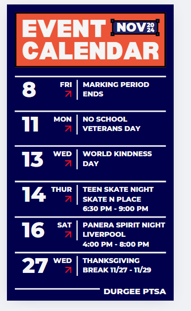 We wanted to share the PTSA events planned for November and would greatly appreciate any help in promoting these on Durgee News or the marquee sign. Your support in spreading the word means a lot to us and strengthens our PTSA efforts!
