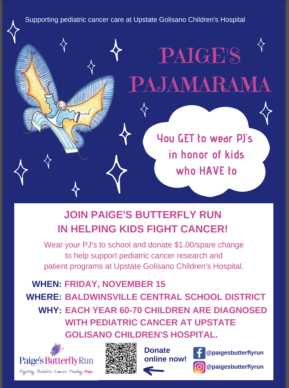 It is time for us to begin preparing for our District wide participation in this year's Paige's Pajamarama fundraiser for the Paige's Butterfly Run organization. There are school district's from around CNY that participate in this fundraiser on Friday, November 15th this year and the organization is thrilled that the entire Baldwinsville District will be participating!! We raised over $7000 last year and with your help, we know we will do even more this year!! Remember that all of these funds go to support local children and their families, who are battling cancer. Advertising should begin around November 1st and you can use the PNG and attached PDF below.